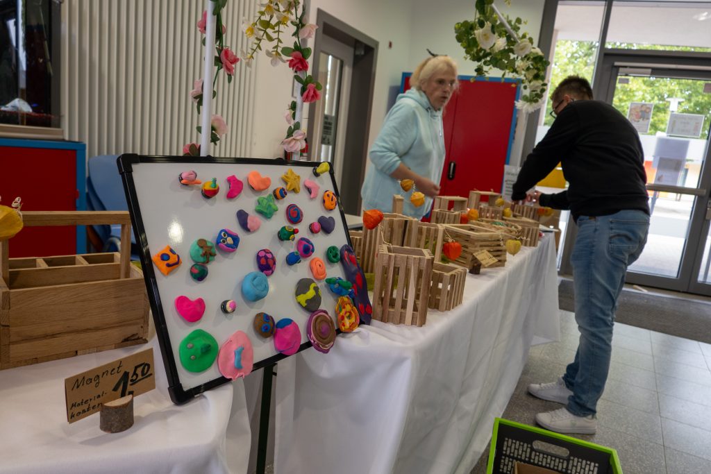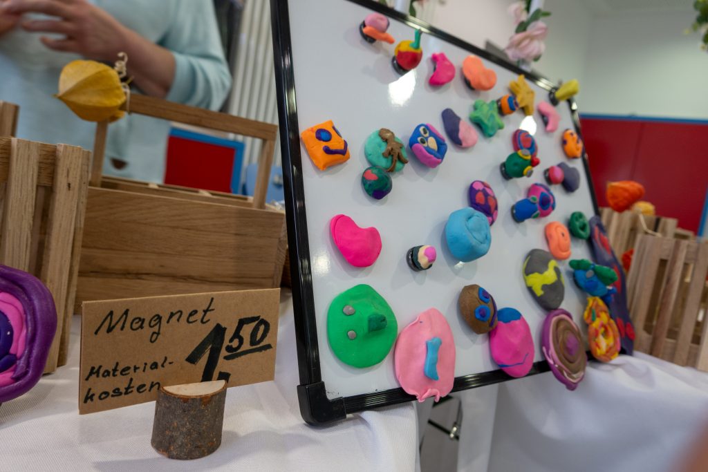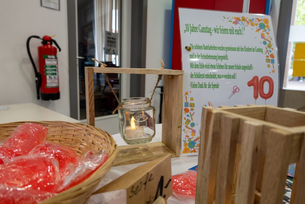Hier ließ sich auch ein Verkaufsstand finden, der viele Interessierte anzog. Die Gäste konnten gegen eine Spende kleine Schätze erwerben – hergestellt von den Kindern in den AGs, in der zurückliegenden Ferienbetreuung und mit Unterstützung des Ganztagsteams und der Praktikant*innen.