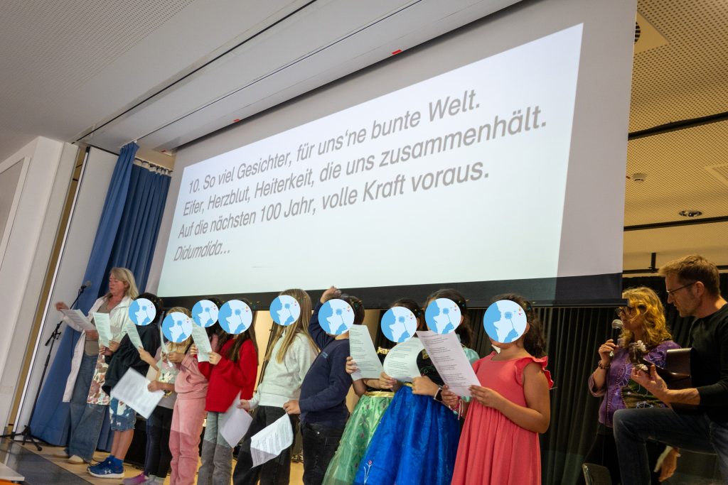 Im Anschluss an die Begrüßungsworte wurde es musikalisch: Der Schulchor sang das eigens gestaltete Ganztagslied zum 10. Geburtstag vor, entwickelt von Frau Krämer, Frau Schmidt und Herrn Schlingmann. In diesem hatten all unsere Mitarbeitenden des Ganztages einen eigenen kleinen Auftritt! Der Chor hat damit einen Moment geschaffen, der viele berührte und sicher noch lange in Erinnerung bleiben wird.