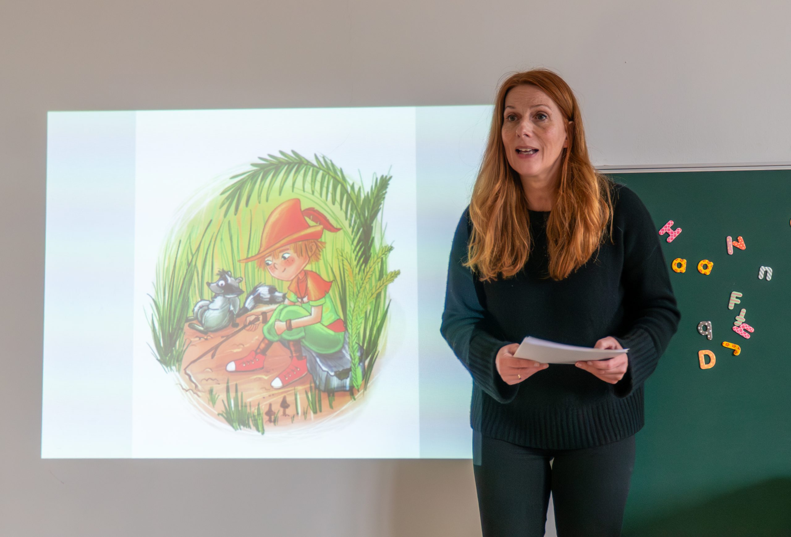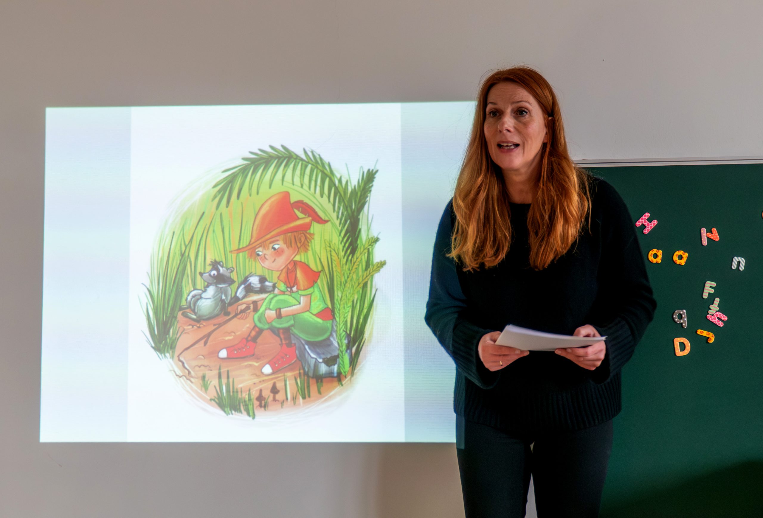 Nina Weger präsentierte die Lesung lebendig und szenisch: mit verschiedenen Stimmen, kleinen Schauspielszenen und passenden Zeichnungen zu jedem Kapitel. Zur Auflockerung baute sie kurze Bewegungseinheiten ein, die thematisch zur Räubergeschichte passten und den Kindern kleine aktive Pausen gaben.